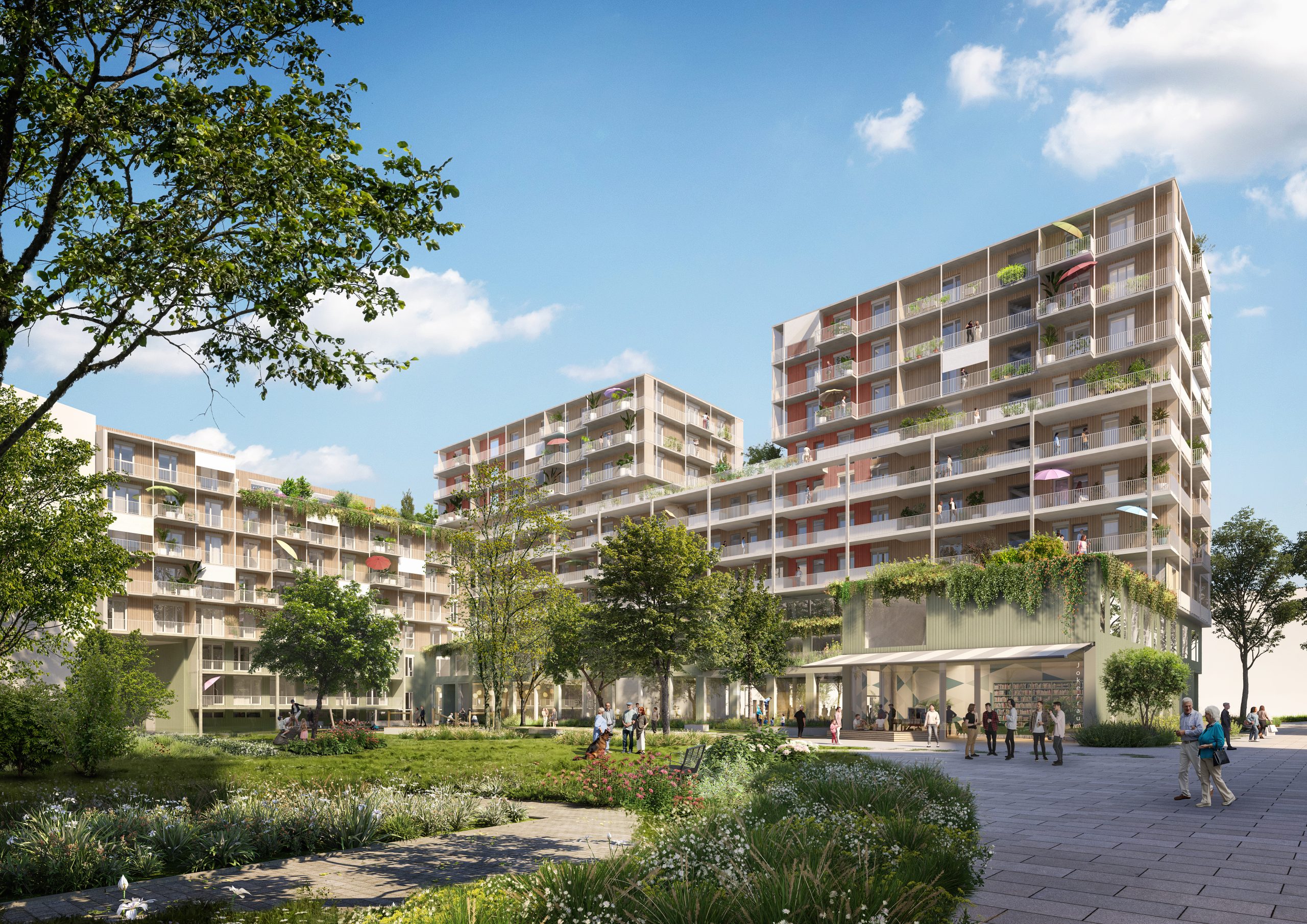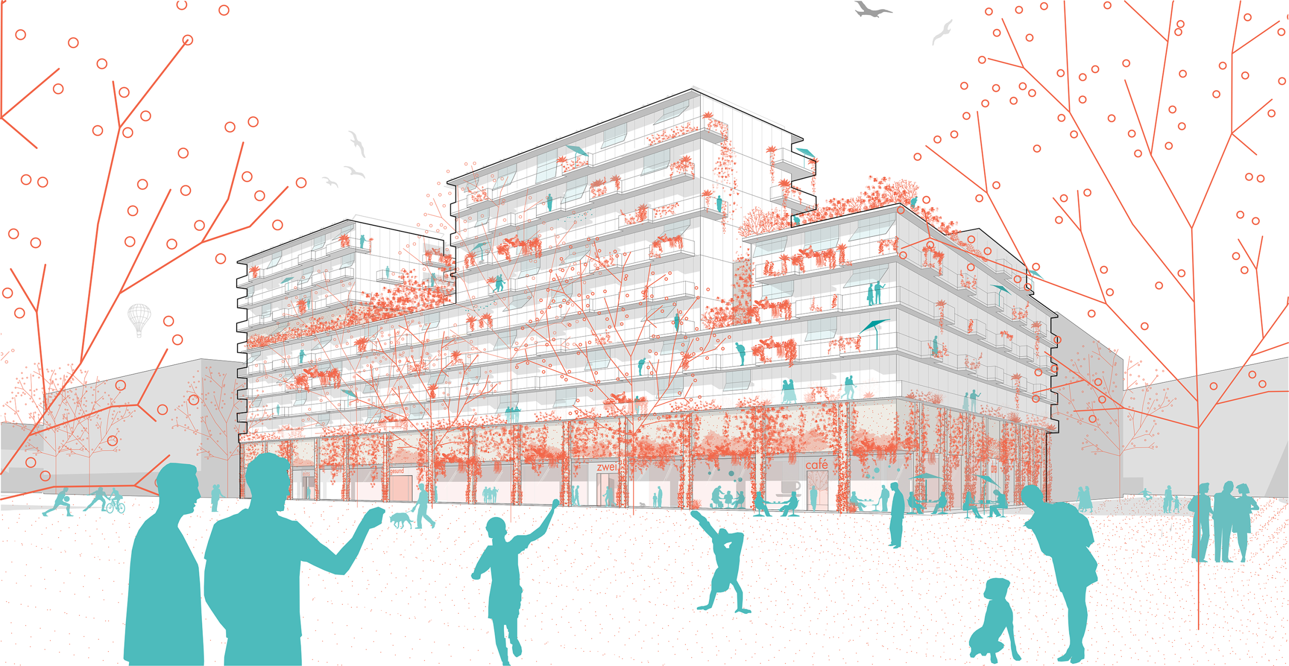 Im „luv + lee“ kombiniert querkraft die neuesten ökologischen Standards mit innovativen Techniken zur Klimawandelanpassung. Fassadenbegrünung, Gründächer mit Biodiversitätsansatz und ein ausgeklügeltes Regenwassermanagement sorgen für ein umweltfreundliches Quartier. Durch Bauteilaktivierung, Grauwassernutzung und CO₂-reduzierte Baumaterialien wird nicht nur die Umwelt geschont, sondern werden auch die laufenden Kosten gesenkt. Architekt Peter Sapp, Partner querkraft, dazu: „Das Projekt luv + lee will einen aktiven und lebendigen Beitrag zur Stadtentwicklung im Nordwestbahnviertel leisten. Der Holz-Beton-Hybridbau schafft einen abwechslungsreichen Lebensraum für unterschiedlichste Nutzergruppen auf vielen Ebenen. Der Fokus liegt auf flexiblem, qualitativem Wohnen, unter anderem mittels Low-tech-Maßnahmen wie der topografischen Gestaltung des Hofes als Kaltluftsee, welcher durch natürliche Thermik das Gebäudeinnere kühlt.“ Im zweigeschossigen Gewerbesockel werden Begegnungsräume für das Grätzel geschaffen.