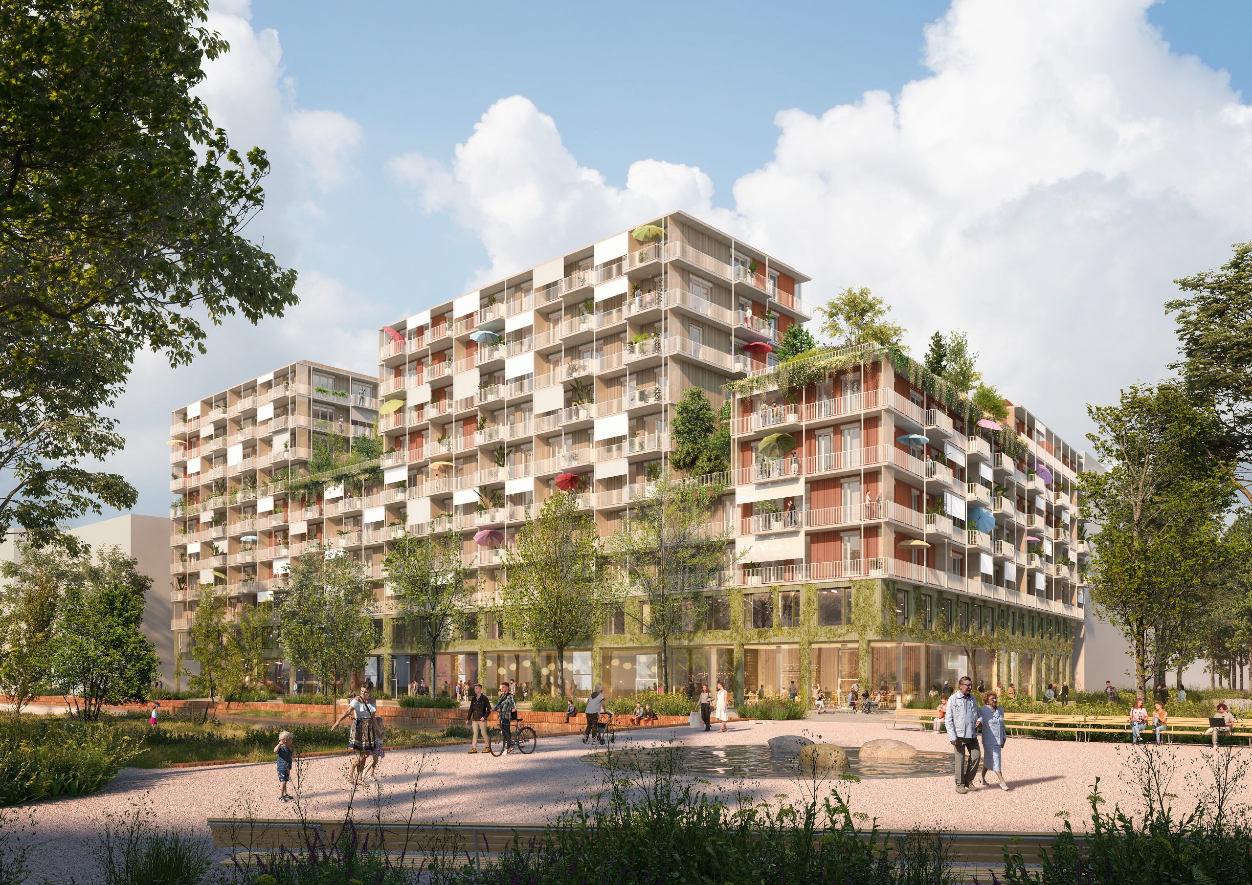 Das neue Viertel soll innerstädtisches Wohnen und Arbeiten mit höchstem Freizeit- und Erholungswert vereinen. Es gibt ein umfassendes Konzept für klimafitte Freiräume vom deutschen Planungsbüro Treibhaus Landschaftsarchitektur, mit einem zehn Hektar umfassenden Grünbereich, der „Grünen Mitte“. Der Masterplan für den neuen Stadtteil stammt vom Schweizer Architekturbüro Ernst Niklaus Fausch Partner. Besonderes Augenmerk liegt auf dem Wiederverwenden vorhandener Baumaterialien. Beton spielt dabei eine entscheidende Rolle – gleich der erste Wohnbau der Arwag, geplant von querkraft, wird mit Bauteilaktivierung für gleichmäßig temperierte Wohnungen sorgen. Sebastian Spaun, Geschäftsführer der VÖZ, sagt: „Österreich braucht leistbaren Wohnraum. Gleichzeitig verlangt die Klimakrise nach umweltfreundlichen, flächensparenden und energieeffizienten Lösungen im Bauwesen. Hier kann der Baustoff Beton seine Stärken ausspielen, denn er ist langlebig, vielseitig, wiederverwend- und recycelbar. Die Verwendung von CO₂-reduzierten Zementen kann außerdem einen entscheidenden Beitrag zu mehr Nachhaltigkeit leisten. Die Stadtentwicklung am Nordwestbahnhof hat das Zeug zu einem weiteren Vorzeigebeispiel.“